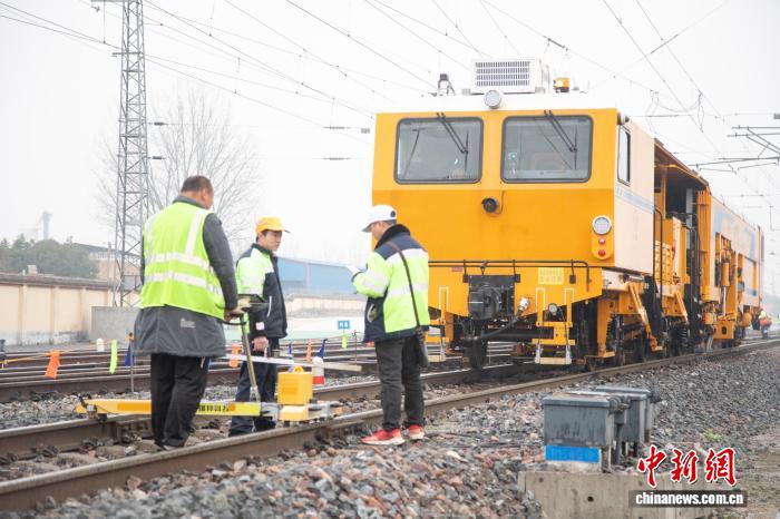 图为功课职员对于捣固后的线道装备多少尺寸停止丈量。王阔宁磊 摄