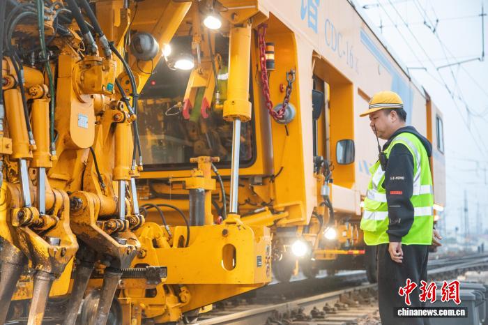 图为功课职员对于讲岔停止捣固。王阔宁磊 摄